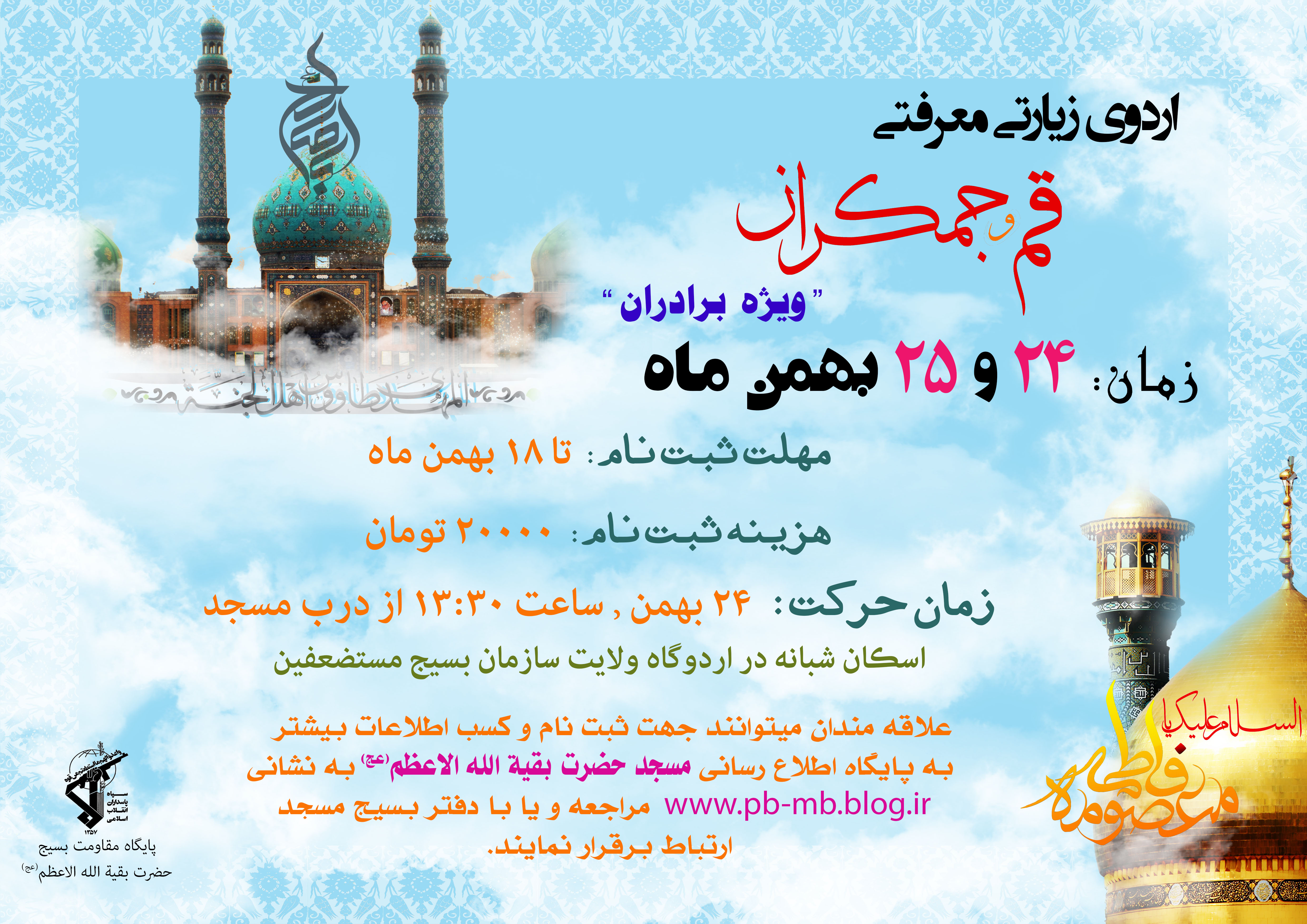 جهت ثبت نام ، فرم ثبت نام را دریافت نموده و پس از تکمیل ، همراه با وجه اردو تا روز جمعه18 بهمن ماه ، هر شب بعد از نماز مغرب و عشاءبه دفتر بسیج مسجد حضرت بقیة الله(عج) واقع در خ اشرفی اصفهانی ، بالاتر از بزرگراه نیایش ، 35 متری طالقانی ، انتهای کوچه نهم نزد برادر نوری مراجعه نمایید .
