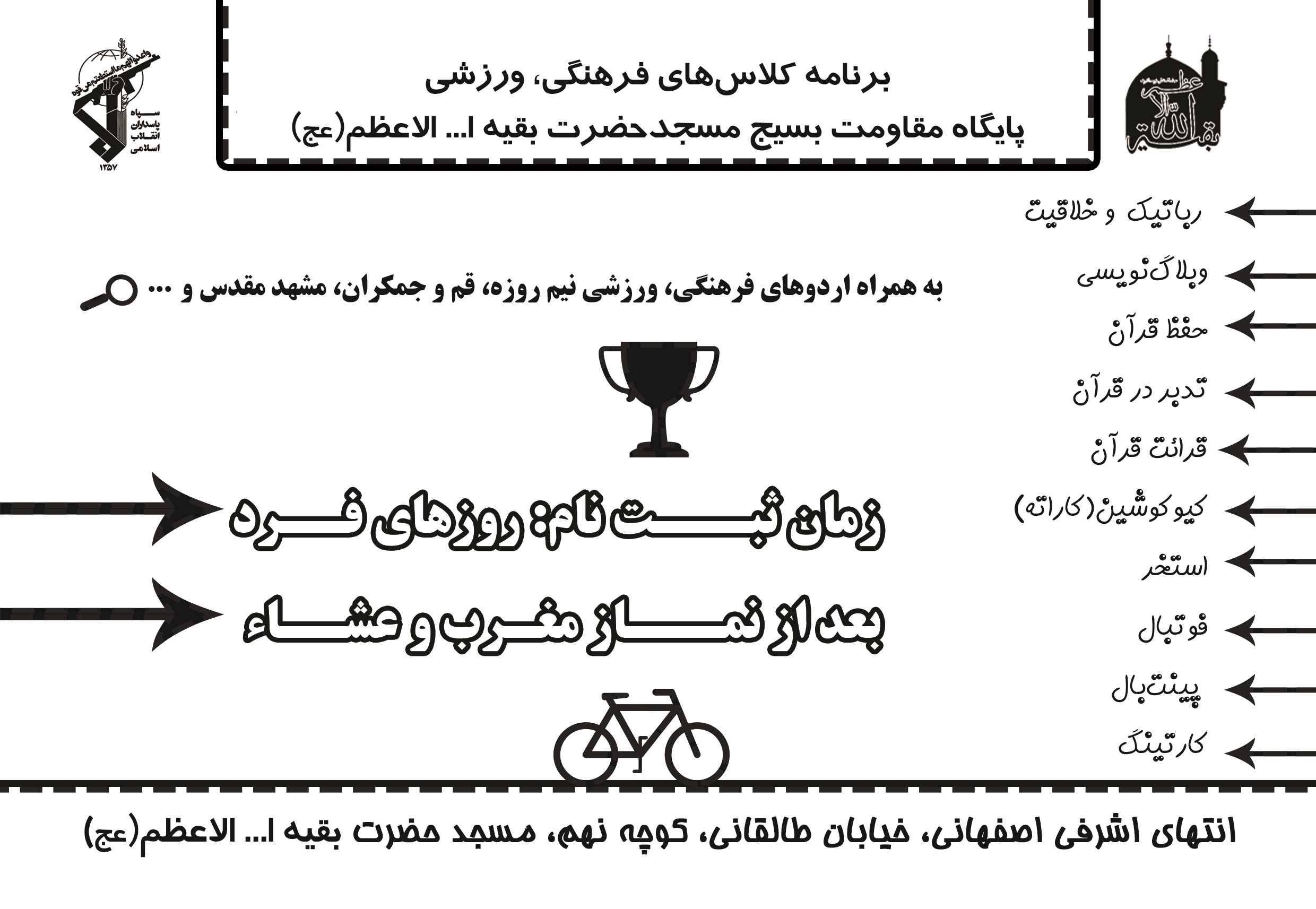 -ویژه برنامه صبح جمعه دعای ندبه و بازی و سرگرمی گروهیعلاقمندان به هریک از کلاسهای فوق میتوانند