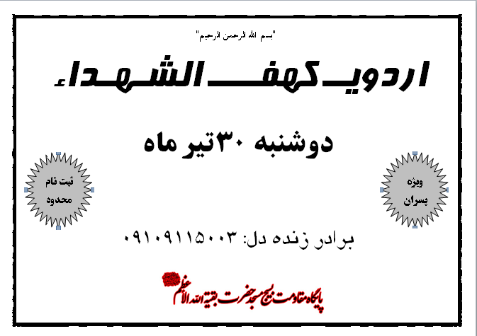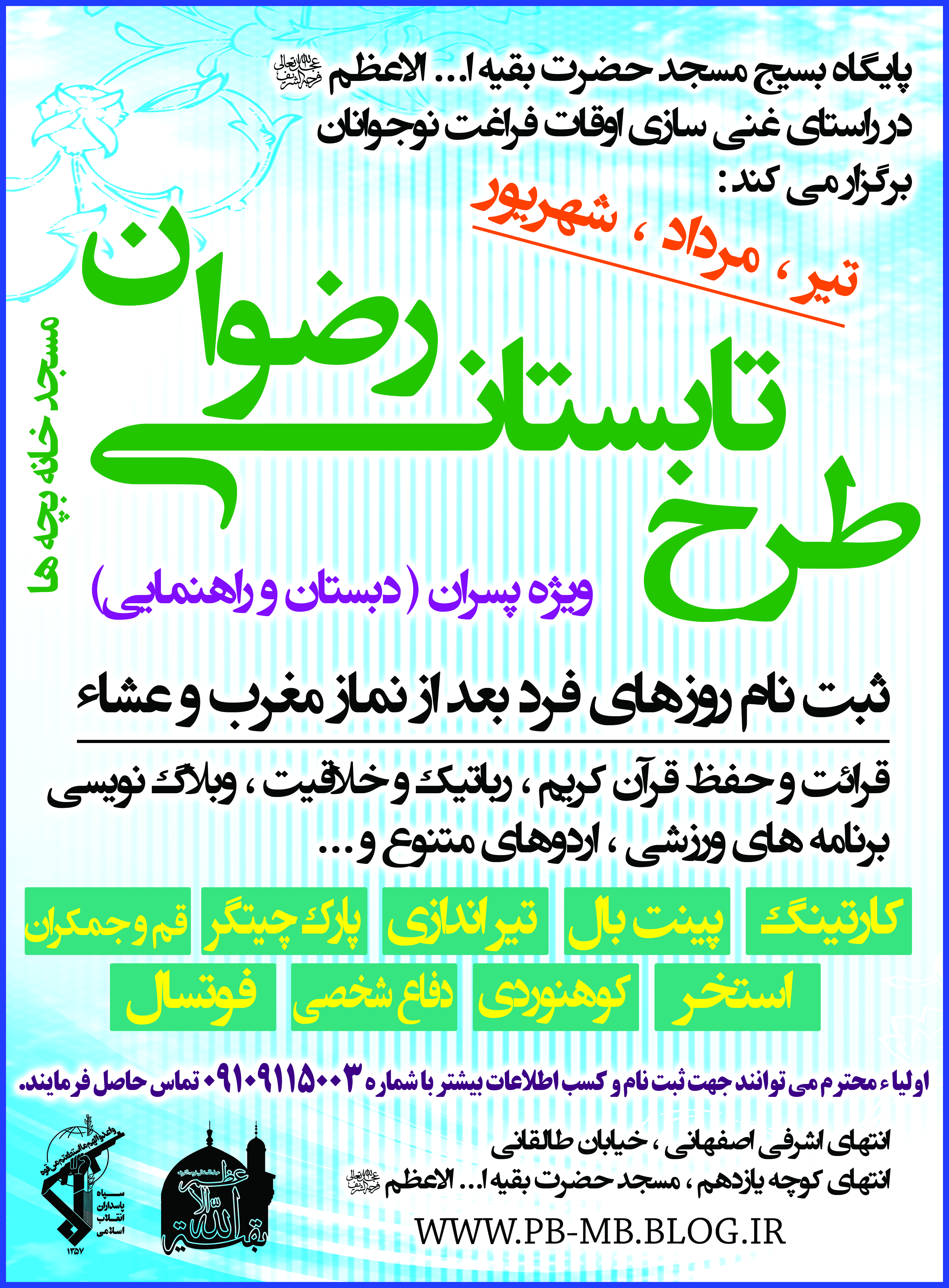 جهت ثبت نام ، فرم ثبت نام را دریافت نموده و پس از تکمیل ، تا روز یکشنبه ، هر شب بعد از نماز مغرب و عشاءبه دفتر بسیج مسجد حضرت بقیة الله(عج) واقع در خ اشرفی اصفهانی ، بالاتر از بزرگراه نیایش ، 35 متری طالقانی ، انتهای کوچه نهم نزد برادر زنده دل مراجعه نمایید .